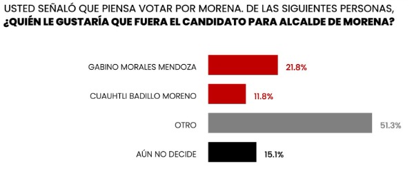 En Morena, partido que hoy lidera las preferencias electorales, el diputado federal Gabino Morales Mendoza se colocó como el aspirante mejor posicionado con 21.8%, seguido del diputado local Cuauhtli Badillo Moreno con 11.8%. Aun así, 54.3% de los encuestados opina que el candidato debería ser alguien distinto, lo que deja claro que, pese a la ventaja del partido, los perfiles actuales no terminan de convencer al electorado.