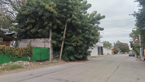 De acuerdo con los habitantes, el árbol ha provocado que un poste de luz se encuentre ladeado, mientras que el cableado cuelga a baja altura, obstruyendo el paso peatonal y el acceso a una cochera, lo que dificulta la movilidad diaria.