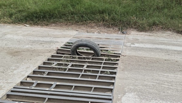 De manera improvisada, en el centro de la rejilla fue colocada una llanta aparentemente para evitar que vehículos o personas caigan dentro, sin embargo, esta medida no elimina el peligro, principalmente para motociclistas, ciclistas y peatones que transitan diariamente por la zona.