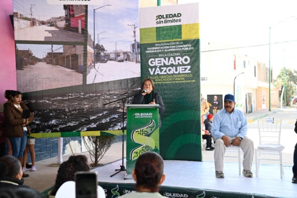 Juan Manuel Navarro Muñiz, Alcalde de Soledad de Graciano Sánchez, inauguró y entregó oficialmente, este martes, la pavimentación con concreto hidráulico y alumbrado público de las calles Revolución, Libertad, Desarrollo, Educación y Unión, en la colonia Genaro Vázquez, una obra histórica que marca un antes y un después para más de 4 mil 200 beneficiarios, con una inversión superior a los 19 millones de pesos, con lo que se logra transformar por completo la vida diaria de las familias que por años esperaron calles dignas, seguras y funcionales.