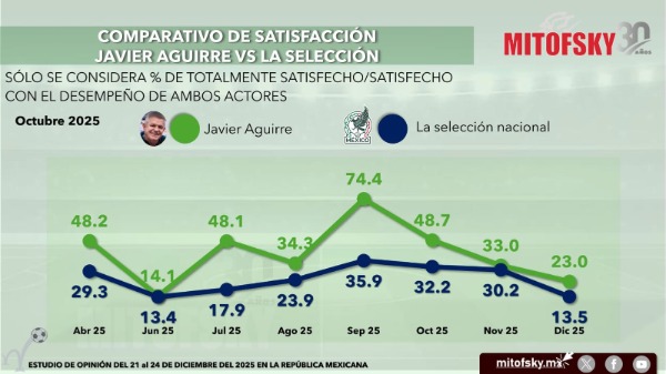 El técnico Javier Aguirre sufre el mayor desplome: de 74% de satisfacción total en septiembre 2025 (tras la Copa Oro) cayó a solo 21% en enero, casi empatado con la baja aprobación al desempeño de la Selección (17%). Cuatro meses seguidos de retroceso reflejan el desencanto tras las pobres victorias de 2026 ante Panamá y Bolivia.