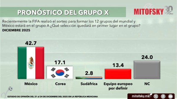 En el Grupo X (México, Corea del Sur, Sudáfrica y un europeo por definir), los aficionados dan a México como favorito para el primer lugar (42.7%), seguido de un equipo europeo (24%), Sudáfrica (13.4%) y Corea (17.1%).