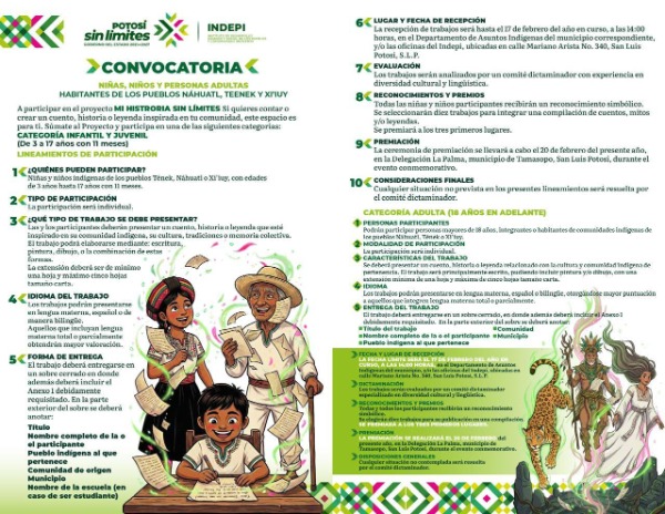 En cumplimiento a la política de inclusión y respeto a los derechos de los pueblos originarios impulsada por el Gobernador Ricardo Gallardo Cardona, y en el marco del Día Internacional de la Lengua Materna, el Instituto de Desarrollo Humano y Social de los Pueblos y Comunidades Indígenas (Indepi) abrió la convocatoria "Mi historia sin límites", dirigida a rescatar cuentos, historias y leyendas de los pueblos Tének, Náhuatl y Xi’iuy, como una acción para fortalecer la identidad cultural y la preservación de las lenguas maternas.