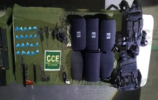 En el lugar se aseguraron cuatro armas de fuego largas calibre 5.56 milímetros, tres armas de fuego cortas, 408 cartuchos útiles calibre 5.56 milímetros, 22 cargadores, ocho placas balísticas, dos chalecos tácticos, cinco radios de comunicación, así como 20 dosis de sustancia granulada con características similares al "cristal", además de camioneta color blanco.