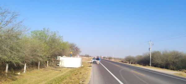 El camión tipo caja transportaba insumos para centros penitenciarios de la Huasteca Potosina. Según reportes, el conductor dormitó al volante, salió de la carretera y volcó. Por fortuna, sufrió lesiones leves.