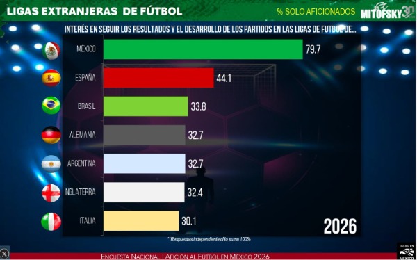Más allá del Viejo Continente, el reporte destaca un interés estratégico en los "graneros" de talento del sur. Brasil, con un 33.8% de preferencia, se consolida como la tercera liga más seguida en México, mientras que Argentina y Alemania empatan con un 32.7%, seguidas muy de cerca por Inglaterra con un 32.4% e Italia con un 30.1%.