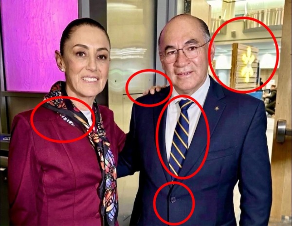 Los cambios en la foto son evidentes. En la original, el alcalde vestía una corbata de cuadros marrón y amarillo; en la versión difundida aparece con rayas amarillas y azules. Además, se modificó el fondo con desenfoque para ocultar a los asistentes, se eliminaron los lentes de Galindo y se añadió digitalmente la mano de Sheinbaum sobre su hombro. También desaparecieron los gafetes oficiales del evento, aunque aún se puede ver el cordón de la presidenta.