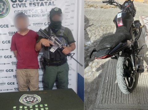 Elementos de la Guardia Civil Estatal de San Luis Potosí detuvieron a un hombre señalado como presunto distribuidor de droga y presuntamente vinculado con el robo de motocicletas en el municipio de Cerritos.