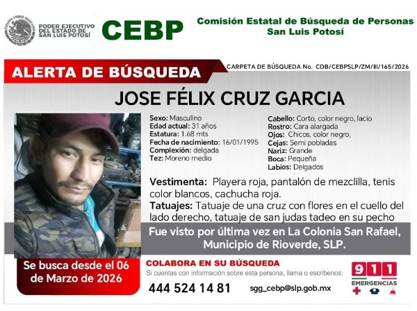 Se trata de José Félix Cruz García de 31 años de edad, visto por última vez el 6 de marzo pasado en la colonia San Rafael; como señas particulares tiene un tatuaje de una cruz con flores en el cuello lado derecho, además de la imagen de San Judas Tadeo en el pecho, viste pantalón de mezclilla, playera roja, tenis blancos y cachucha roja.
