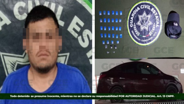 En la colonia La Diana, agentes de la GCE le aseguraron al detenido, 28 dosis de la droga sintética conocida como "cristal", cinco dosis de "crack", además de un vehículo Nissan Versa, en el que se desplazaba.