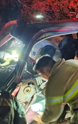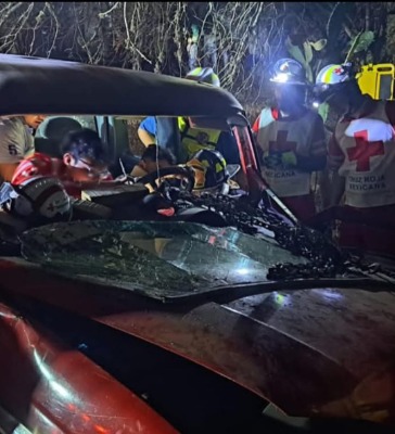 El conductor de una camioneta quedó prensado entre los fierros retorcidos, luego del estrepitoso choque contra un mezquite ocurrido en la carretera Cárdenas- Rayón, la noche del domingo.