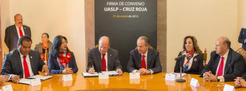 El documento lo firmaron por la UASLP el rector arquitecto Manuel Fermín Villar Rubio y por la Cruz Roja Mexicana el presidente Nacional Lic. Fernando Suinaga Cárdenas y el delegado estatal de la Cruz Roja Lic. Oscar Segura Rodríguez, en donde fungió como testigo de honor el Gobernador del Estado Dr. Juan Manuel Carreras López.