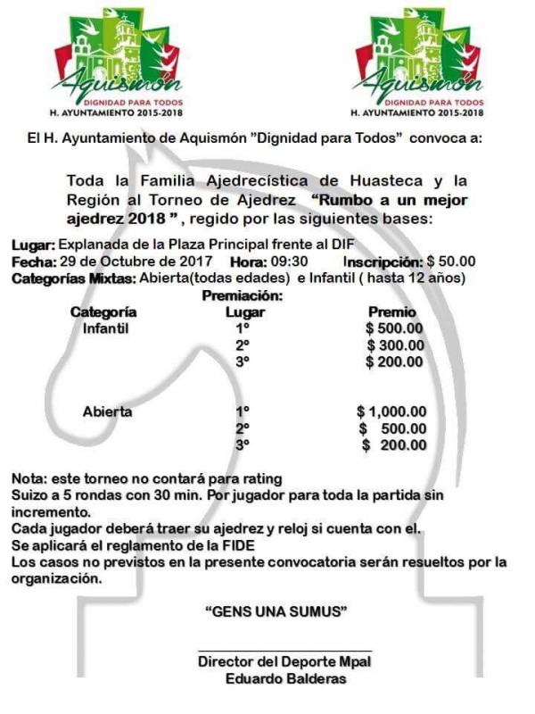 El Gobierno Municipal de Aquismón a través de la Dirección de Deportes invita toda la población al Torneo de Ajedrez denominado "Rumbo a un mejor ajedrez 2018".