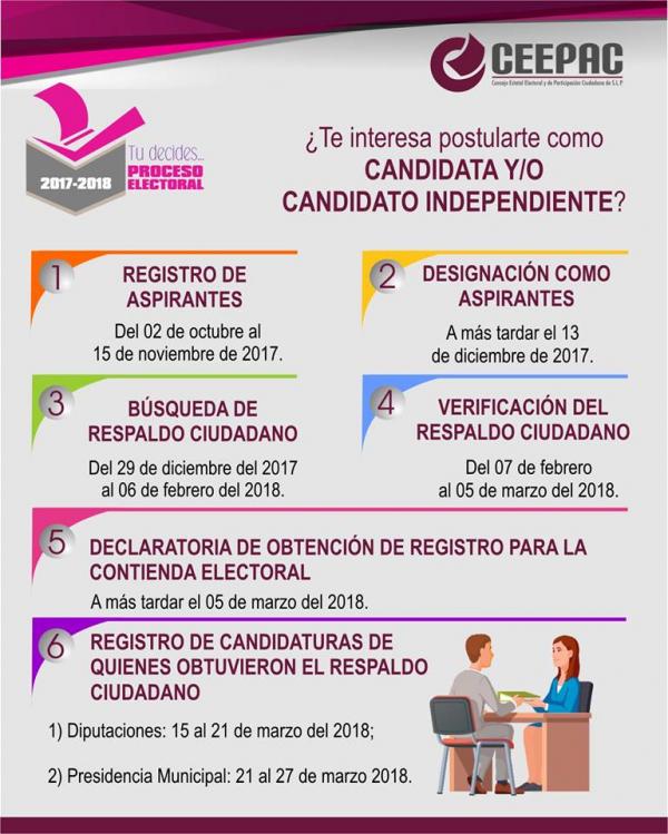La obtención de respaldo ciudadano será del 29 de diciembre del 2017 al 6 de febrero del 2018, la verificación de cédulas de manifestación de respaldo ciudadano del 7 de febrero al 5 de marzo del 2018, la declaratoria de quienes obtengan registro para contender como Candidato o Candidata Independiente en la contienda electoral, será el 5 de marzo del 2018, a más tardar.