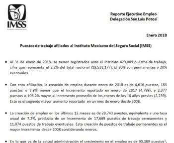 El Instituto Mexicano del Seguro Social (IMSS), reportó que al 31 de enero de 2018, se tienen registrados ante el Instituto 429,089 puestos de trabajo, cifra que representa el 2.2% del total nacional (19,532,177). El 80% son permanentes y 20% eventuales. Con esta afiliación, la creación de empleo durante enero de 2018 es de 4,616 puestos, 183 puestos o 3.8% menor que el incremento reportado en enero de 2017 (4,799), y 2,377 puestos o 106.2% mayor al incremento promedio de los eneros de los 10 años previos (2,239). Este es el segundo mayor aumento reportado en un mes de enero desde 2008.