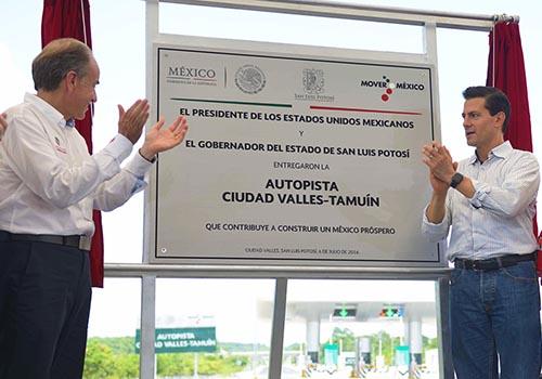 El Presidente de la República Enrique Peña Nieto y el Gobernador del Estado Juan Manuel Carreras López, inauguraron la autopista Ciudad Valles-Tamuín, con una longitud de 49.1 kilómetros, en donde se invirtieron 3 mil 50 millones de pesos que beneficiará a 378 mil 200 habitantes de la zona, con lo que se fortalece el eje transoceánico del Pacífico con el Golfo de México.