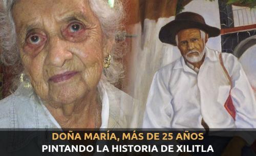 A sus 92 años la señora María Rivera de Soberón lleva más de 2 décadas pintando cuadros que representan la historia, los lugares más emblemáticos y personajes populares del municipio de Xilitla, mismos que expone de manera gratuita en su casa, ubicada a unos metros de la plaza principal.
