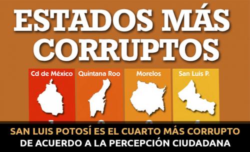 Relacionada con trámites, permisos y contacto con autoridades de los tres niveles, San Luis Potosí es el cuarto más corrupto de acuerdo a la percepción ciudadana, esto de acuerdo a datos contenidos en la Encuesta Nacional de Calidad e Impacto Gubernamental 2017 que dio a conocer el pasado 6 de diciembre el Instituto Nacional de Estadística, Geografía e Informática (INEGI).