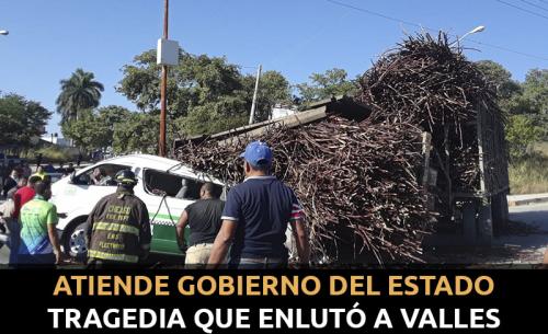El Gobierno del Estado está pendiente al resultado de las investigaciones de la tragedia ocurrida el viernes 21 de diciembre en la carretera Valles-Mante y el acceso al fraccionamiento Valle Alto en Ciudad Valles, cuando un camión cañero que llevaba además enganchada una jaula, cayó de costado sobre una unidad de transporte público, provocando la muerte de tres integrantes de una familia y dejando a un niño huérfano.