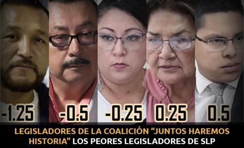Las y los legisladores peor evaluados son: Pedro César Carrizales Becerra, quien obtuvo una calificación de -1.25 (postulado por el PT), Mario Lárraga Delgado con -0.5 (PES), Alejandra Valdés Martínez (Morena) con -0.25, Rosa Zúñiga Luna (Morena) con 0.25 y Edson de Jesús Quintanar Sánchez (Morena) con 0.5.