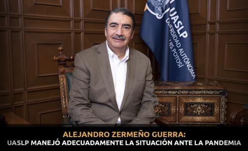 "La pandemia ha sido un problema para todo el mundo sin duda, la universidad creo que la supo manejar adecuadamente, tuvimos la fortuna de adaptarnos rápidamente a las clases en línea, que estoy consciente que no es lo mejor, pero realmente era una buena posibilidad de seguir trabajando, aunque fuera, vamos decirlo así, no en las mejores condiciones para no suspender por completo la transmisión del conocimiento, entonces la adaptación fue importante hasta el momento, de casi año y medio", afirmó el Rector de la UASLP, Alejandro Zermeño Guerra.