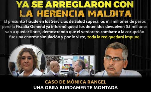 Nuestra óptica por lo sucedido y como se dieron las cosas, y por la forma en la que actuó la Fiscalía General del Estado en el caso de la doctora Mónica Liliana Rangel Martínez, es que vimos cómo fue la conclusión de la obra burdamente montada, una obra teatral melodramática que parecía ya planeada, es muy evidente que había un acuerdo para simular que iban a ir contra la "herencia maldita", que iba a haber consecuencias contra toda la red.