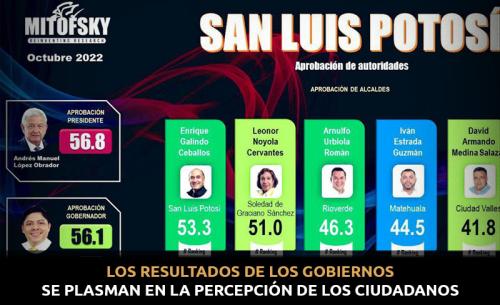 Lo anterior es publicado luego de haber evaluado la aprobación de 150 alcaldes del país, dentro de los que se evaluó a 5 presidentes de San Luis Potosí, encabezando el top 3 de mayor aprobación en SLP el edil capitalino Enrique Galindo, secundado por Leonor Noyola de Soledad de Graciano Sánchez (51%) y Arnulfo Urbiola de Rioverde (46.3).