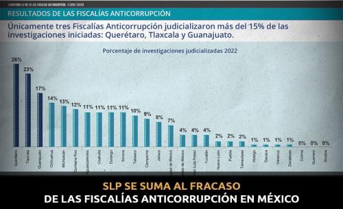 La Fiscalía Anticorrupción en San Luis Potosí ha conseguido cero sentencias condenatorias entre 2020 y 2022, de acuerdo con la segunda edición del reporte "Levantemos la Voz de las Fiscalías Anticorrupción", elaborado por el Instituto Mexicano para la Competitividad y la organización TOJIL.