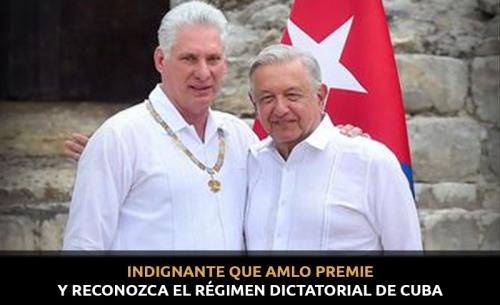 Indigna y da un sentimiento de rechazo el que el presidente de la República, Andrés Manuel López Obrador otorgue a Miguel Díaz-Canel, Presidente de Cuba, un reconocimiento porque el pueblo de Cuba es algo muy diferente al gobierno de Cuba, y algo que debe quedar muy claro es que no es una indignación o una objeción que se presente respecto a ese pueblo hermano con el que nos unen profundos vínculos de lucha, de identidad, de apoyo político, cultural, etc. Sino más bien es no avalar una práctica política sobre-ideologizada que ha restringido libertades, que ha restringido la democracia, la posibilidad de tener elecciones libres en ese pueblo y que una revolución que data de 1959, ha instaurado en la isla un régimen dictatorial de corte militar represivo donde Díaz-Canel es la cara civil más reciente de un régimen que siempre tuvo rostro militar en una tiranía hereditaria