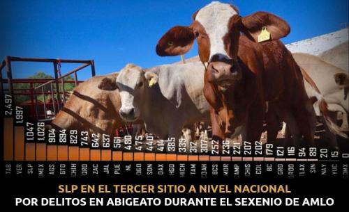 Uno de los más graves problemas para los ganaderos de todo el país, es ser víctimas de abigeato, cuyas cifras desde el inicio del sexenio del presidente de la República; asimismo de acuerdo a estudios realizados, en México se registra un nuevo caso, cada 21 horas, ocupando el primer sitio con el mayor número de denuncias el estado de Tabasco, seguido de Veracruz, y en tercer lugar, el estado potosino.