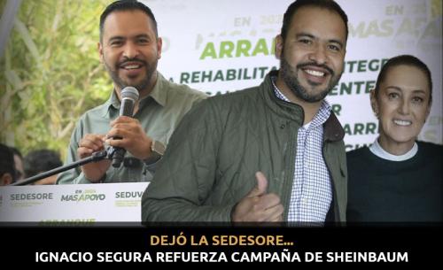Los buenos resultados logrados en la Sedesore incluso le valieron a Ignacio Segura el reconocimiento de Claudia Sheinbaum, con quien sostuvo una reunión recientemente, y al respecto comentó "ahorita también la razón de la cual me retiro de la Secretaría es muy importante, si bien estamos abanderando el tema de una candidatura al Senado, también quiero compartirte que la misma Presidenta nos ha pedido al equipo político, a mi persona, que me haga cargo de dos distritos en el estado de Jalisco, entonces estamos también a cargo de una zona ya regional, no sólo San Luis Potosí, sino la parte colindante con Jalisco, estamos prácticamente abonando todo el trabajo que pueda hacer yo como operación política para la campaña de la doctora Claudia, y en breve tener una Presidenta de la República que sea Claudio Sheinbaum".