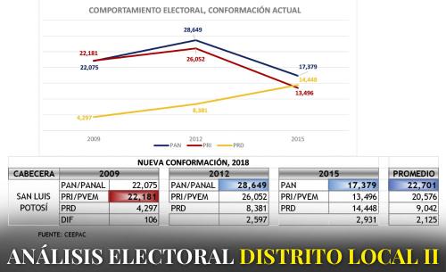En cuanto al promedio de votación en el distrito, éste favorece al PAN, seguido del PRI con una diferencia a favor del primero de 2,125 votos, y en tercer lugar el PRD con un crecimiento considerable en cada elección.