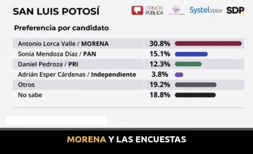 En el caso específico de San Luis Potosí, el estudio revela que Lorca Valle con Morena tendría un 30.8 por ciento de votantes, seguido por Sonia Mendoza Díaz del PAN con 15.1 por ciento, luego Daniel Pedroza Gaitán del PRI con 12.3 por ciento. También aparece el alcalde de Ciudad Valles, Adrián Esper Cárdenas como independiente con el 3.8 por ciento. Lo interesante es que el 38 por ciento restante respondió por “Otros” o “No sabe”. Es decir, la balanza se podría mover hacia cualquier lado.