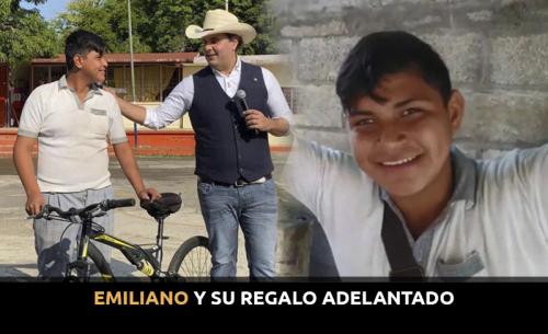 Emilio Hernández Bolaños es un joven estudiante de 14 años de la secundaria del ejido Zocohuite en Ciudad Valles, no se esperó que este día con la visita de funcionarios del Ayuntamiento a la escuela del ejido para realizar los honores de cada lunes, recibiría como regalo una bicicleta nueva, lo que le dio una gran alegría ya que él no tenía una propia y es el medio de transporte que utiliza para llegar todos los días a su escuela.