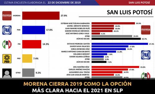 Una encuesta realizada por Massive Caller da cuenta de que el partido Morena termina el 2019 y se perfila hacia el 2021, como el favorito para ganar 12 gubernaturas de las que se disputarán en ese próximo proceso electoral, entre ellas San Luis Potosí, sin embargo, aquí su ventaja no es clara.