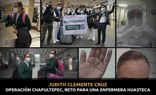 Judith Clemente Cruz tiene 24 años de edad, es originaria de Ciudad Valles y es auxiliar de enfermería general; "la vocación me nació cuando era adolescente, como a los 15 años, cuando era niña no me pasó nunca por la mente esta profesión", comenta.
