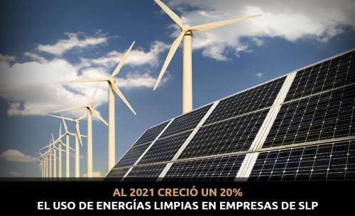En el 2019, el uso de energías limpias en empresas de la zona industrial de San Luis Potosí era de apenas un 5%; sin embargo, a través de los años, el porcentaje de empresas que optan por energías limpias para llevar a cabo sus procesos se ha incrementado, pues tan sólo del 2020 al 2021 el porcentaje de empresas que usan este tipo de tecnologías se incrementó un 20%.