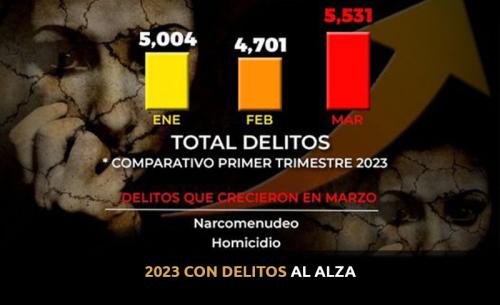Con datos oficiales publicados Secretariado Ejecutivo del Sistema Nacional de Seguridad Pública de enero a marzo de este 2023, se aprecia un crecimiento en el total de delitos.