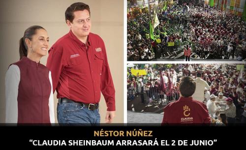 El coordinador de la segunda circunscripción de la campaña presidencial de Claudia Sheinbaum, Néstor Núñez López, asegura que la candidata de la coalición "Juntos Sigamos Haciendo Historia" está encaminada hacia una victoria contundente en las elecciones del 2 de junio. Núñez López destacó el excelente desempeño de Sheinbaum y el respaldo que está recibiendo en diversos estados del país.