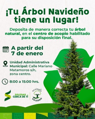 Para reducir residuos, promover el reciclaje orgánico y fortalecer la cultura ecológica entre las familias soledenses, el Ayuntamiento de Soledad de Graciano Sánchez puso en marcha un programa de recolección de árboles naturales utilizados durante la temporada navideña, una acción ambiental que mantiene una política cercana a la población y atenta al cuidado del entorno, siguiendo la visión del Alcalde Juan Manuel Navarro Muñiz leer Más