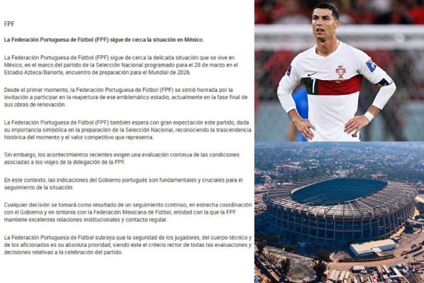 Finalmente, la Federación Portuguesa de Futbol reiteró que la seguridad es el elemento más importante para que no terminen cancelando el partido ante la Selección Mexicana, dejando en análisis el compromiso programado para el próximo sábado 28 de marzo: