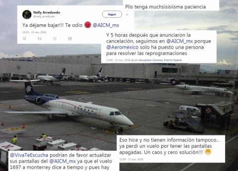 Llevo en el @AICM_mx desde las 5 de la mañana. Entiendo que las cancelaciones y retrasos se deben al clima, y que eso no es culpa de nadie. Pero lo que sí es una mentada es la desinformación y desorden que hay aquí. Eso sí es culpa de alguien. ??— Fernando Elizondo (@ferelgar) 21 de noviembre de 2018 Esto ya no es por neblina!!!!! ?? t.co/eSOYV24O0d" target="_blank">pic.twitter.com/eSOYV24O0d— Isela Garcia (@IselaGarcia0411) 21 de noviembre de 2018 Eso hice y no tienen información tampoco... ya perdí un vuelo por tener las pantallas apagadas. Un caos y cero solución!!! ??— Sebastián Martinson (@sebamartinson) 21 de noviembre de 2018 Terrible el trato a todos los pasajeros del vuelo #2950 @interjet. Perdí mi 1er chance de conexión y estoy a punto de perder mi 2da opción de subirme al vuelo a mi destino final por su falta de sentido común para resolver una situación de crisis en el @AICM_mx.8 horas de retraso!— Daniela Suárez (@_DanielaSuarez_) 21 de noviembre de 2018 @Aeromexico sus agentes en él @AICM_mx No se dan abasto con todos los clientes con pérdida de conexión y yo en particular necesito información sobre el vuelo AM2634 a Aguascalientes. Agradeceré informes. t.co/euNJIPwJBe" target="_blank">pic.twitter.com/euNJIPwJBe— 73 4??O 1 ?? (@PIXA2015) 21 de noviembre de 2018 @VivaTeEscucha podrian de favor actualizar sus pantallas del @AICM_mx ya que el vuelo 1697 a monterrey dice a tiempo y pues hay como 3 horas de retraso— Juan Pedro Garcia (@JuanPedroGarcia) 21 de noviembre de 2018 ?@VivaAerobus? ?@VivaTeEscucha? Sabes ustedes se este vuelo? Que porque estaba cerrado el ?@AICM_mx? en la manana...pero 6 hrs después y nada que sale??? #mediocres t.co/TzJzN6wYVj" target="_blank">pic.twitter.com/TzJzN6wYVj— D... (@delgado_doris) 21 de noviembre de 2018 Y aterrizamos por fin en el @AICM_mx después de esperar 6 horas en Monterrey. Aterrizamos aquí hace 1 hora, nos mandan una posición remota, y no hay PUTOS camiones para llevarnos a la terminal... Que maravilla de País, que maravilla de 4ta transformación @interjet 2983— Lalo Robles (@LaloRobles) 21 de noviembre de 2018 @AICM_mx caos en el aeropuerto T1 y T2, poca la información que proporcionan— eDward gUiGuI (@eDwardgUiGuI) 21 de noviembre de 2018