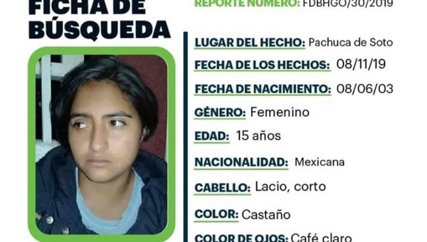 PACHUCA.- Cynthia Guadalupe Díaz Hernández, de 15 años de edad, desapareció el pasado viernes 8 de noviembre en la capital de Hidalgo según la ficha de búsqueda emitida por la PGJEH.