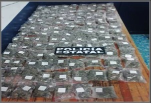 Al emitir una inspección, se localizó en su interior 124 bolsas con una hierba verde y seca con las características físicas de la marihuana, con un peso aproximado de 2 kilos con 230 gramos. Así mismo fueron aseguradas mil 235 bolsas con cristal y varias prendas de vestir.