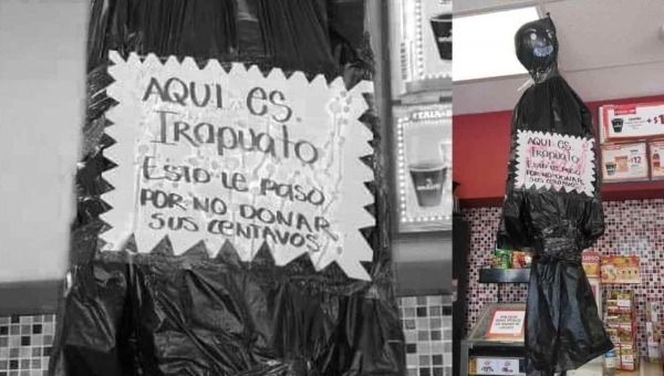 Normalizar la violencia llevándola a una sátira de la realidad es lo que empleados de un oxxo hicieron. Con globos y papel como relleno, advierten con un ´embolsado´ que: "Aquí es Irapuato y, esto le paso por no donar sus centavos".