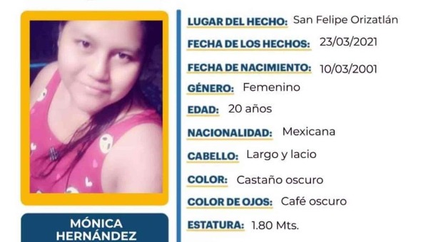 La joven fue vista por última vez el 23 de marzo del presente año en San Felipe Orizatlán y desde entonces desconocen su paradero. Ante dicha situación, Mónica Hernández se considera persona no localizada.