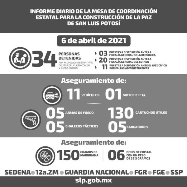 Se reportó también que 34 personas detenidas fueron puestas a disposición de las autoridades por diversos delitos y faltas, de los cuales 3 fueron remitidos ante la Fiscalía General de la República, 20 quedaron a disposición de la Fiscalía General del Estado y 11 presentados ante el juez cívico por faltas administrativas.