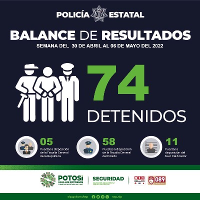 En el periodo comprendido del 30 de abril al 06 de mayo de 2022, Policías Estatales detuvieron a diversos objetivos criminales generadores de violencia en la Entidad potosina, dando como resultado 74 personas detenidas; 05 de ellas a disposición de la Fiscalía General de la República, 58 ante la Fiscalía General del Estado y 11 más presentadas al Juez Cívico Calificador por faltas administrativas.