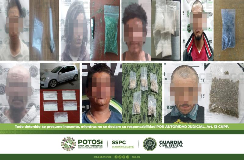 Como resultado a los dispositivos de vigilancia y disuasión de delitos para garantizar espacios seguros a las familias potosinas, 14 personas fueron detenidas por oficiales de la Guardia Civil Estatal por el probable delito de posesión de enervantes, en distintas zonas del territorio estatal.