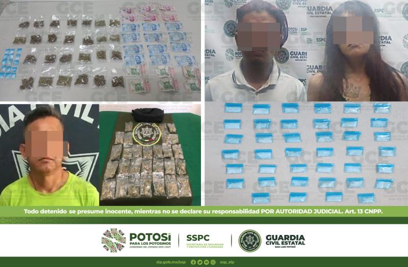 Dentro de las acciones para el combate frontal contra el delito de narcomenudeo, desdobladas en todo el territorio potosino por parte de policías de la Guardia Civil Estatal (GCE), cuatro presuntos narcomenudistas resultaron detenidos en distintas ubicaciones, logrando el aseguramiento de casi 100 dosis de droga. Resalta que entre ellos, se encuentra un joven menor de edad.